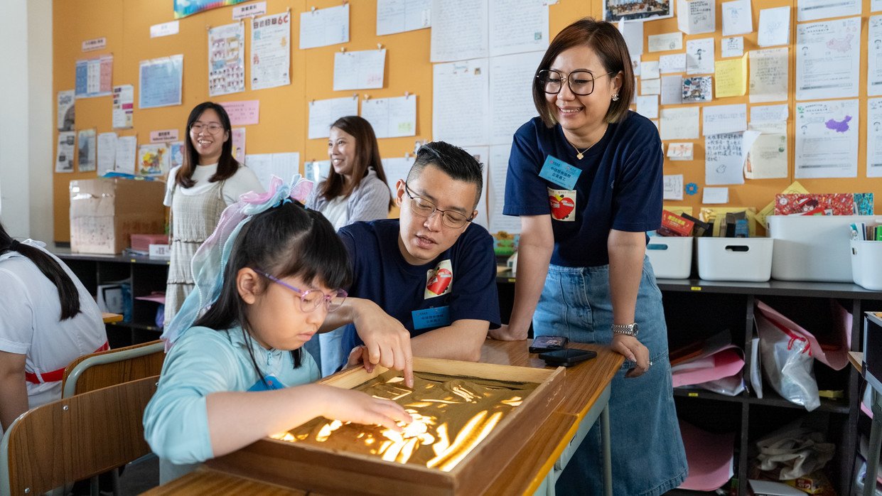 典礼其中一个亮点是青年表演者结合沙画与音乐的「共感.同行」演出,以艺术形式演绎情绪管理之道。此外,现场派发的互动纪念品「共感.同行卡」设计巧妙,可摺叠成握手或赞好手势,寓意「共感连心,互助同行」。典礼仪式完成后,参与活动的学生分组体验四大特色工作坊,包括飙速盘竞赛、沙画创作、禅绕画设计以及非洲鼓合奏,而中信证券国际企业义工亦全程参与,与学生互动交流,真正实现「共感」与「同行」。